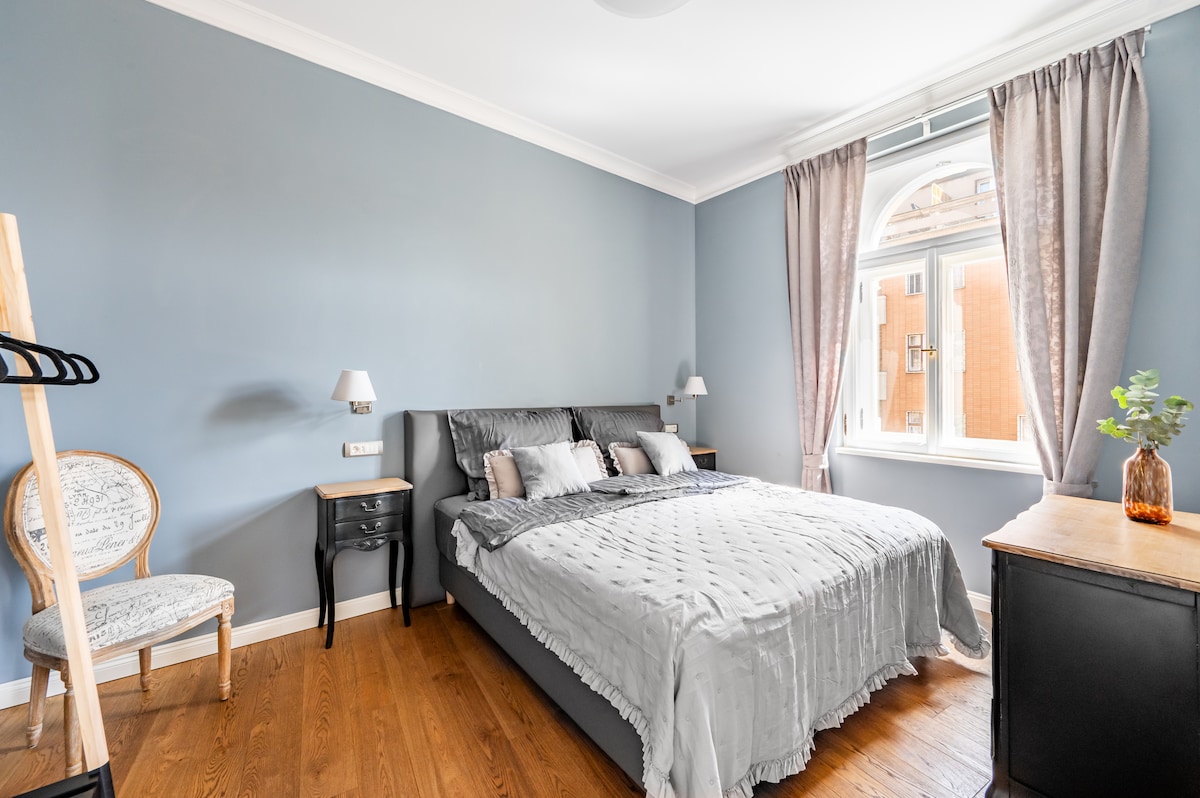 Spacious and light place with unigue views in old residatial neighborhood. Luxuriously furnished apartment offers comfort at every moment of your stay. Fully equipped kitchen, bathroom with shower and bathtub with a breathtaking view, TV with Netflix, quiet bedroom with a comfortable bed. Cafes, bakeries and bistros, pubs with the best Czech beer and cuisine, a local market right next door. Direct public transport to the airport, train station, Prague Castle, Old Town Astronomical Clock.