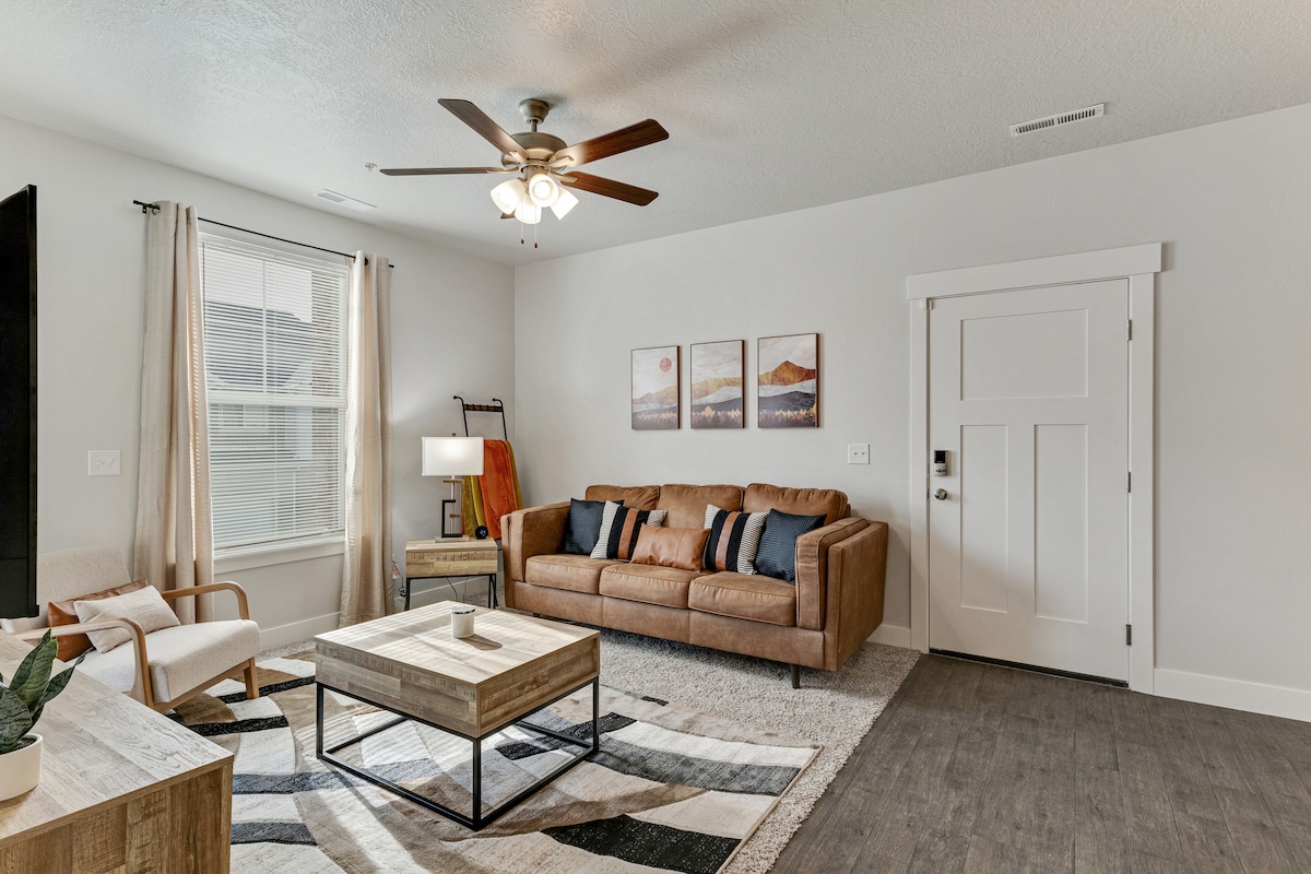 Premiere location near Riverwoods in NE Provo! Modern, spacious, fully furnished 2 bedroom/2 bathroom condo on ground level. Don't settle for a BASEMENT or place where you have to park your cars outside! KING BED in primary bedroom. Everything you need to make this your "home away from home". Google Fiber for super high speed internet connectivity. Grocery stores 1.4 miles. Costco 2.4 miles. Provo Canyon within a mile. Repeat Guests say this is their favorite spot to stay in Provo.