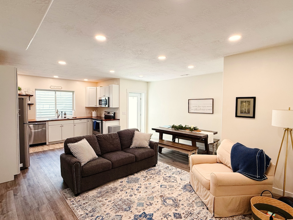 Enjoy easy access to all of utah county from this perfectly located home base. It’s only minutes away from the I-15, provo center street, Downtown Provo, and the Provo River trail system. Great location for anyone visiting BYU, UVU, or any of the other institutions in Provo and Orem. -Newly renovated in 2023. -Private entrance -Washer and Dryer -Large 65” Smart TV -Full size refrigerator -EV charger available to guests (Tesla and other EV’s)