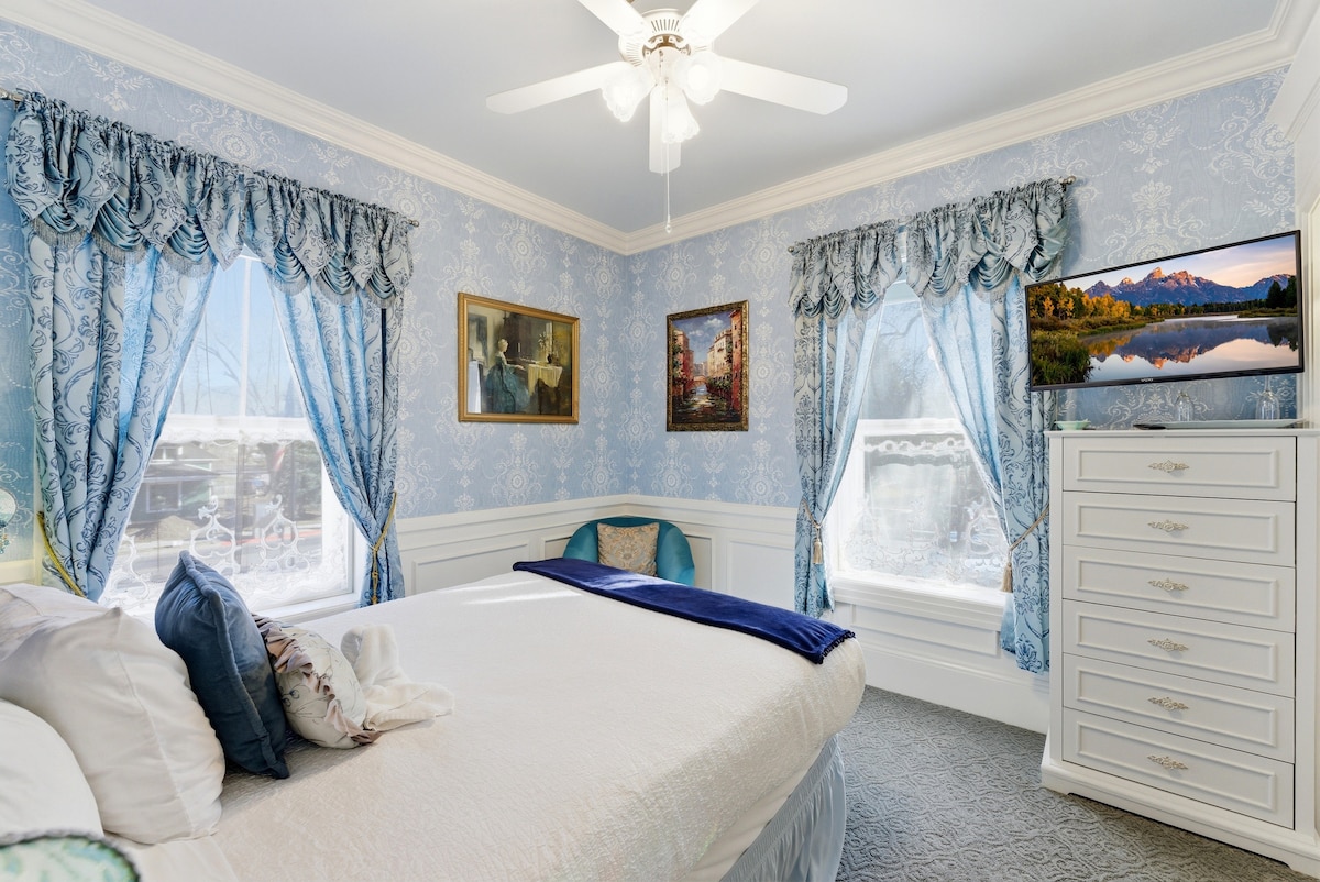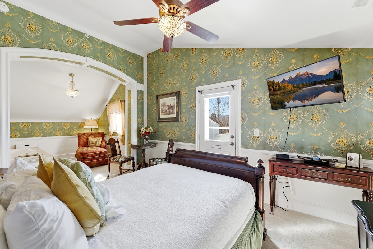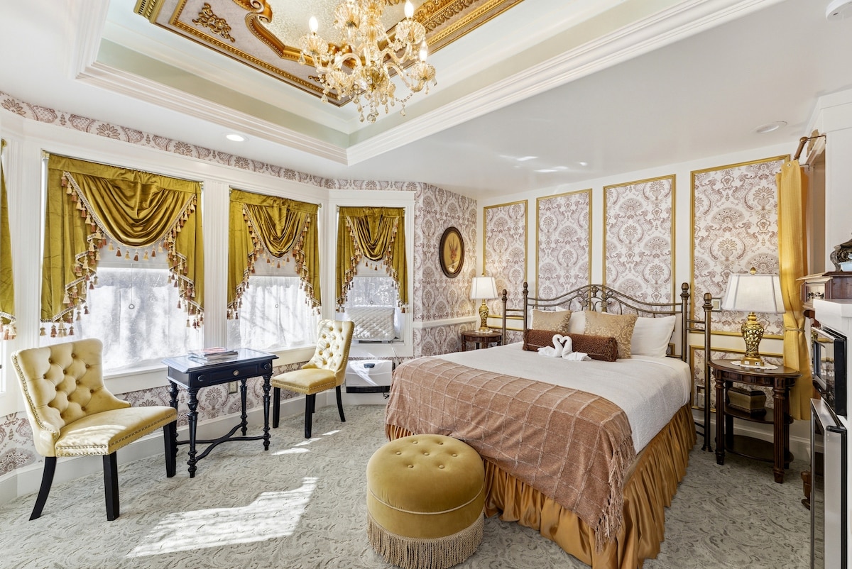 Guest favorite featuring authentic Victorian-era décor, an original early-1900s clawfoot bathtub, and a charming bay window reading nook. Located on the top floor with Tiffany-style lighting, a work desk, and modern amenities. Perfect for history lovers, remote workers, or anyone seeking old-world charm with contemporary comfort. Includes: Queen bed, original clawfoot tub, bay window nook, desk/workstation, mini-fridge, TV, Wi-Fi, in-room safe, independent climate control, bath essentials.