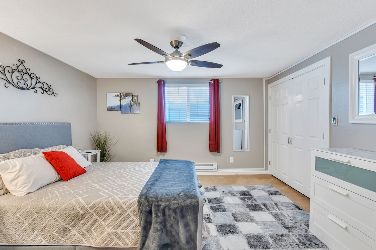 A Private entrance will invite you into your own two-bedroom basement suite. NO CLEANING FEES ***You must agree to our ALLERGY NOTICE to book*** Fall into a deep sleep with queen-size beds and newer furnishings throughout. The cozy living room is great to spread out and relax. Full kitchen and dining area. Enjoy Unlimited Hot water. Endless movies and shows are at your fingertips along with Super High-Speed Wifi. There is plenty of room to relax after a long day of traveling and playing.