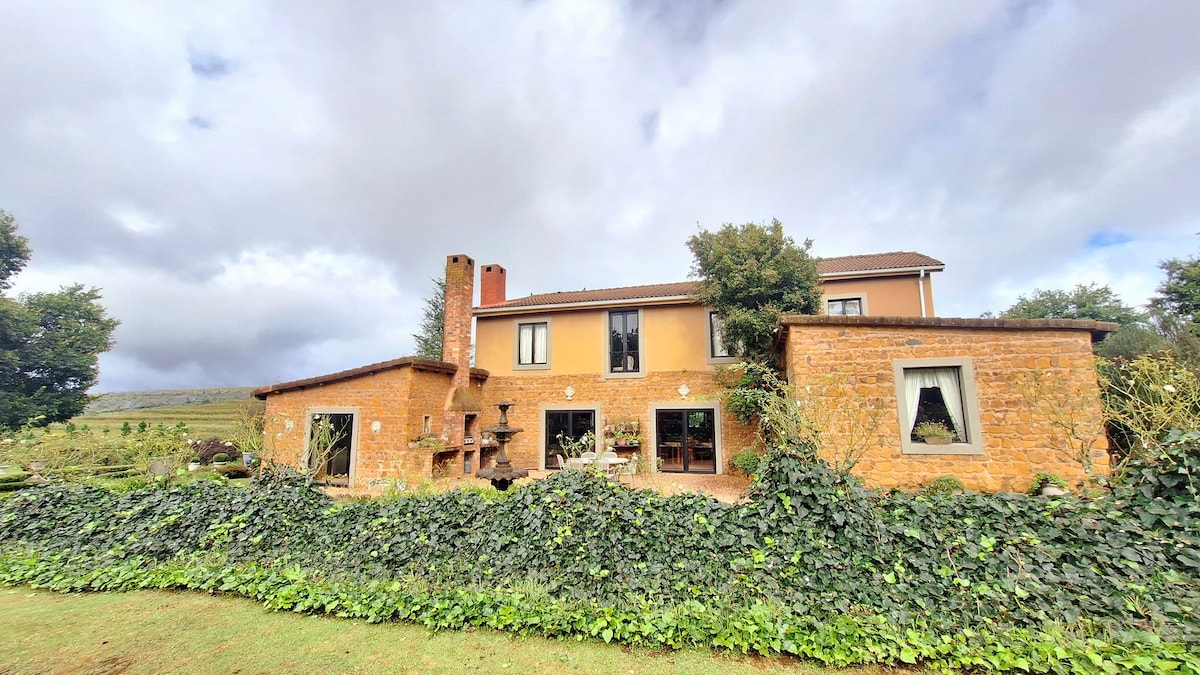 Midway between Johannesburg and Durban. Original stone built mountain cottage with a thatch roof overlooking the Drankensberg. Magnificent views and a champagne climate. The house is situated in a Conservancy protecting the unique fauna and flora of the African Montane biosome.