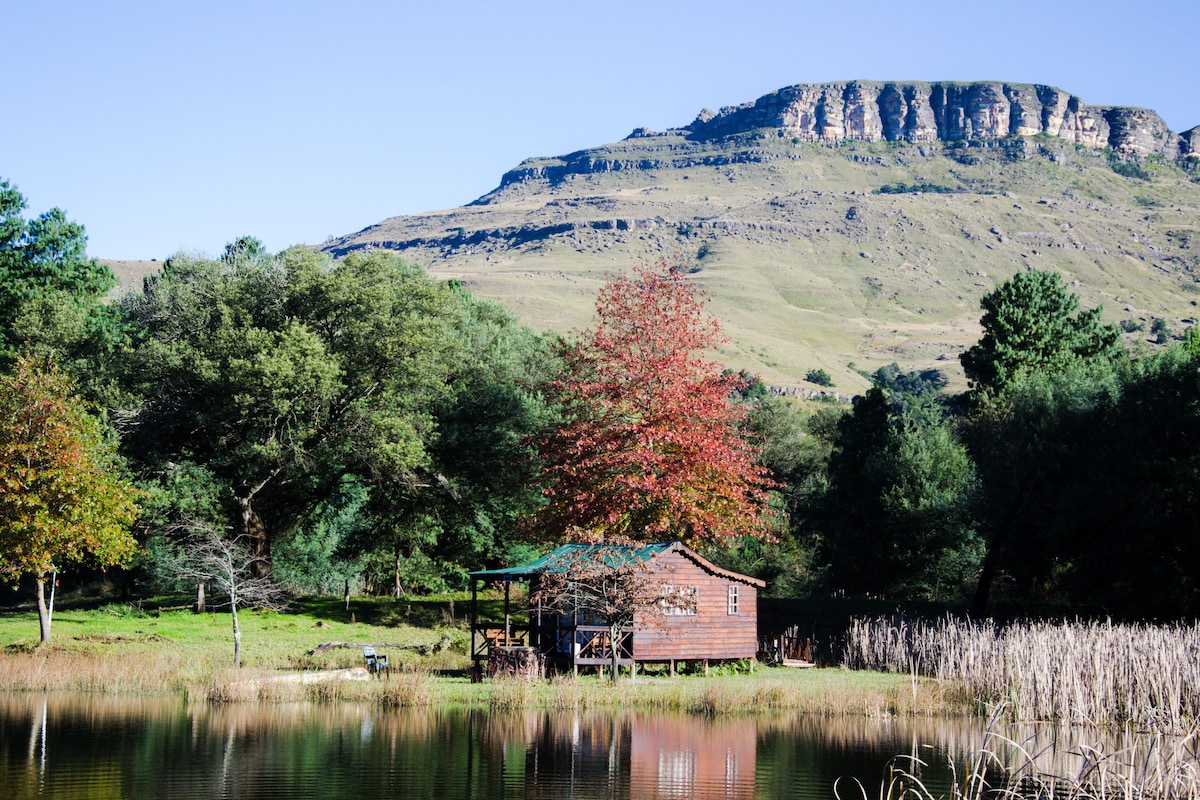 Our wooden cabin over the lake offers a cozy and comfortable stay, with stunning views over the lake and the forests around the property. Enjoy the bird life of which there are a few species. You can enjoy the tranquility, or fish from the deck, or explore the nearby attractions. The cabin is self catering, semi off-grid equipped with a gas geyser supplying hot water to the shower, and we have an ensuite septic based toilet.
