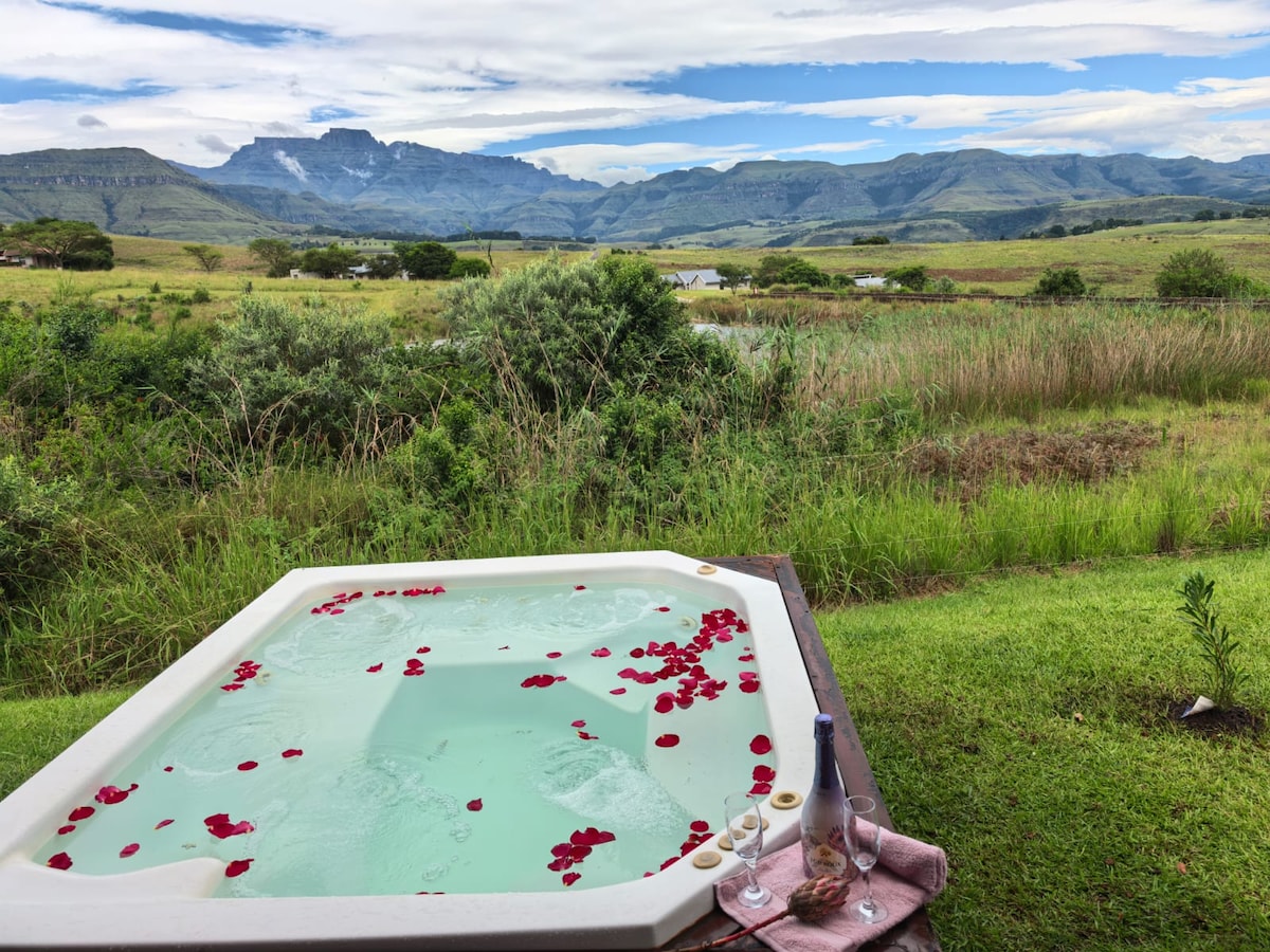 The cottage is nestled within beautiful indigenous gardens. For that special occasion, honeymoon or escape from the stress of everyday life in the city, Kingfisher is the ideal romantic getaway for a couple. Whether you relax in your own jacuzzi on the private patio & garden space with magnificent views of the Central Drakensberg Mountains or participate in the many activities in the valley, the cottage offers a secluded haven for you to relax and unwind!
