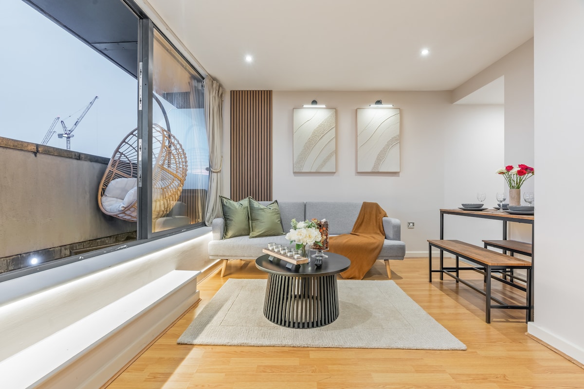 Luxury Penthouse Living: Birmingham Best Skyline View 🕰️24 Hour Self Check-In Top Floor Penthouse. Enjoy Birmingham skyline views from the double balcony with outdoor seating. Sleeps 4 (King Bed, Double Sofa-Bed, Small Kid Sofa-Bed). Features a full kitchen, bath/shower, luxury amenities, and hotel linen. Location: 9 min walk to Bullring/City Centre. Easy access to all train/coach stations. Parking: Free street parking or paid secure parking available. Secure self check-in.