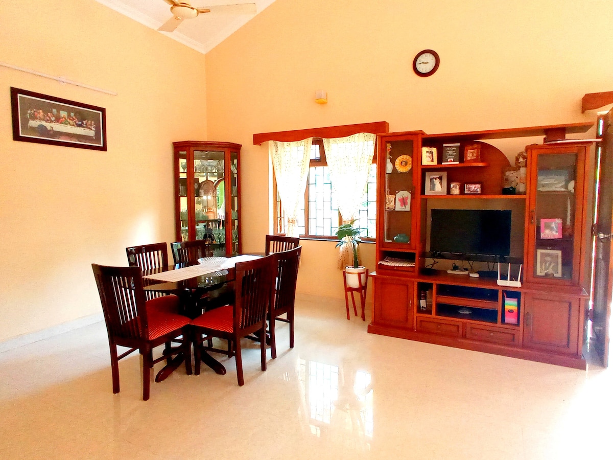 Our AC2 bedroom Deluxe Apartment on the 3rd floor (No lift facility) can accomodate up to 4 guests. It has a fully equipt.kitchen, plenty of hot/cold water, and 2 complete washrooms. Located in a serene village with a bird watching point just round the corner, a beautiful beach 10 to 15 min walking dist. away, good restaurants and a mini mart is also closely located. The Int.Airport, the bus and train stations in close proximity makes our place perfect to relax and enjoy ones stay in Goa.