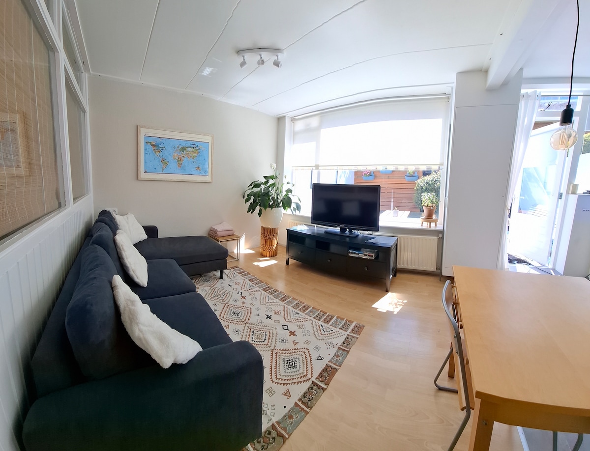 Cosy & comfortable houseboat apartment for a couple or 2 friends. Offering private entrance, living room with sofa bed, kitchenette, bathroom and bedroom. The light and very well insulated 35m2 studio is situated in the former sailors cabin of coaster Mado. On top you’ll have your private deck located directly on the local swimming pond with magnificent view over the harbor. Just 1-5 minutes walking to lot’s of bars, restaurants, shopping mall and bus + tramlines direct to historical center.