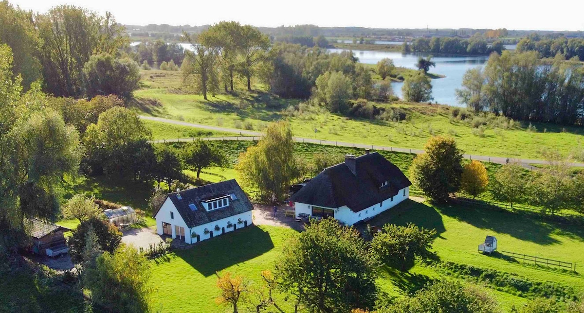 Dit prachtige vakantiehuisje was vroeger een 100 jaar oude wagenschuur, waarvan oude balkenwerk zoveel mogelijk in het zicht is gebleven. Het huisje staat op het erf van onze 400 jaar oude monumentale krukhuis boerderij, waar we wonen met onze schapen, kippen en hond. Het huisje beschikt over een eigen zitje buiten. Tegenover de boerderij zijn de uiterwaarden van de rivier de Lek met de vele leuke kleine strandjes. En op steenworp afstand ligt het gezellige zilverstadje Schoonhoven.