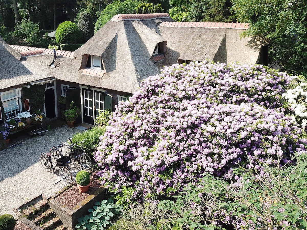 Superb thatched guesthouse with 2 bedrooms and 2 bathrooms. Just 20-25 minutes from Amsterdam and Utrecht and in the heart of 'Het Gooi' within walking distance of the center of Laren. The guesthouse has a spacious living /dining room downstairs, a kitchen and a study room. Upstairs there are two spacious bedrooms with private bathrooms. The guesthouse has a private and beautifully landscaped garden with several seating areas and a barbecue.