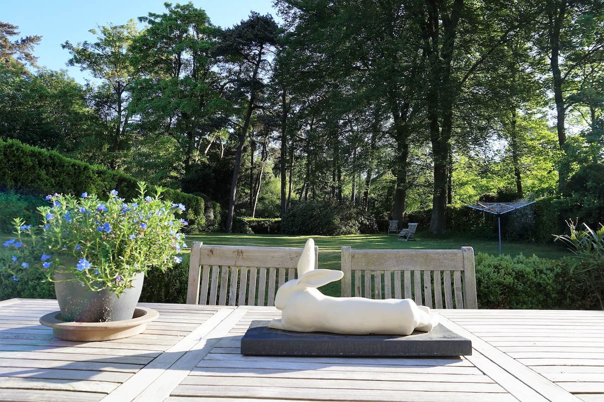 Rustige sfeervolle zonnig gelegen villa uit 1911 met (onverwarmd) zwembad in bosrijke omgeving. Vanaf de ruime terrassen kijk je uit op een bosachtige Engelse landschapstuin. Het huis beschikt op de begane grond over een ruime open-plan kamer. Deze ruimte bestaat uit een eetgedeelte met eettafel van 3 meter, een ruime zithoek en een aparte tv-hoek met bank. Verder is er een keuken, bijkeuken, hal, speelkamer en toilet. De eerste etage heeft drie tweepersoons slaapkamers en een moderne badkamer.
