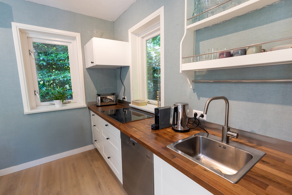 A unique log cabin with modern interior and glass double doors overlooking the yard and sitting area. Well designed interior with all the essentials and many of the non-essentials including a modern kitchen and bathroom. We are proud to provide our guests with the best fairtrade coffee they have ever had. The Siemens EQ6 will make all the Espresso, Cappuccino & Latte Macchiato you like. Centrally located in the Netherlands: 20 min bus to Utrecht. Less then 45 car minutes from Amsterdam.