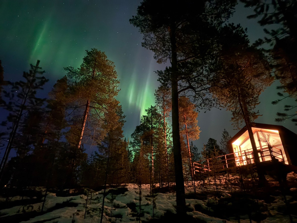 Pieni mökki suurilla lasi-ikkunoilla ja revontulinäkymillä. Puulämmitteinen sauna ja hierova poreallas terassilla, jonka vapaa käyttö sisältyy hintaan. Lemmikit sallittuja, mutta niistä peritään lemmikkimaksu. Small cottage with northern lights view. Sauna with wood-burner stove. Luxury jacuzzi is available for free.