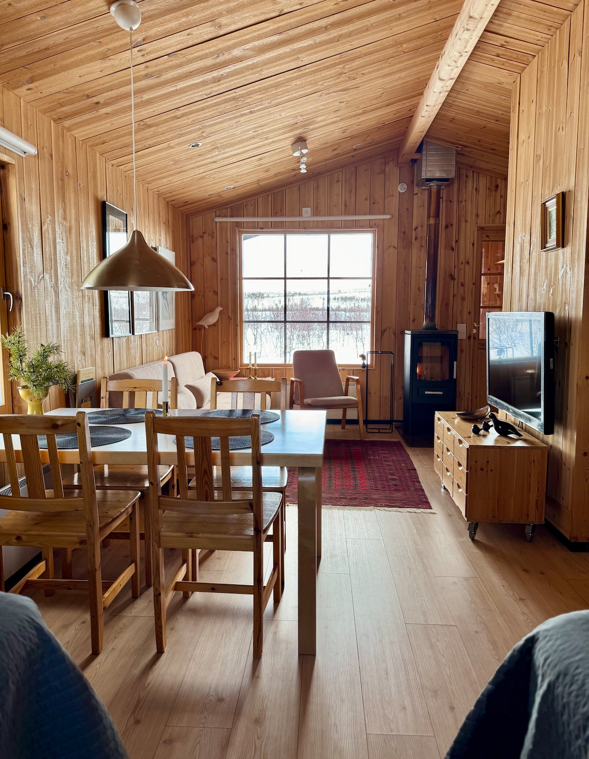 Nyoppført tømmerhytte på ca 75m2 med stor veranda. Stue med sofa, stol og vedfyring. Kjøkken med ovn, oppvaskmaskin, kjøleskap og trivelig spisestue. Stort soverom med dobbelseng. Lite soverom med barneseng. Stor hems med to rom og fire madrasser. Bad med boblebadekar. Hytta har flott utsikt mot Lakselvas øvre del. Bilvei helt fram. Hytta har ikke TV eller wifi, så her får man roen. Vi kan være behjelpelig med tips til severdigheter, turer og anbefalinger generelt.