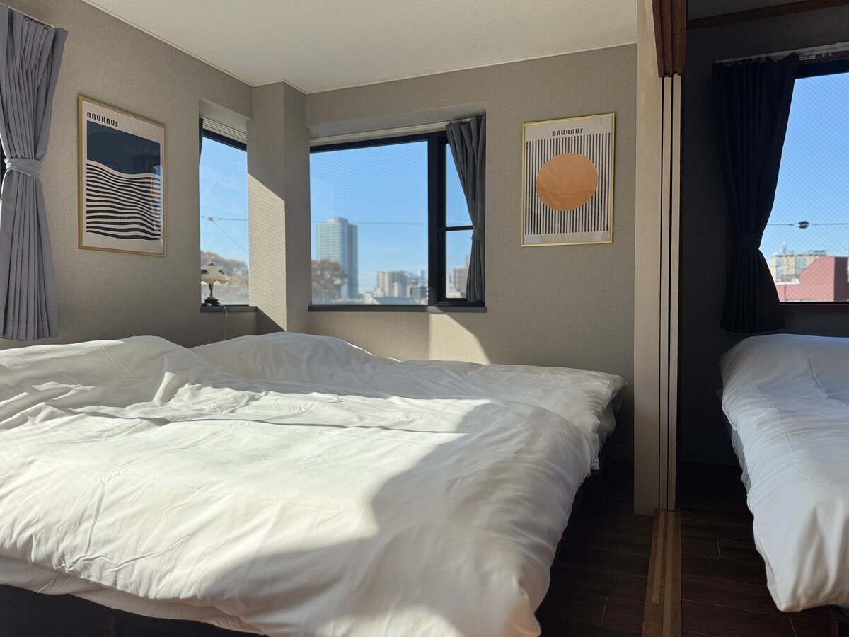 This private accommodation is a 5-minute walk from Kuroiso Station on the JR Tohoku Main Line. The surrounding area has a well-designed library, cafes, large supermarkets, and tourist facilities. The room is on the 4th floor of a 5-story building. There is no elevator. The fully renovated 56-square-meter room has two double beds and three sets of futon mattresses, and the room has a kitchen, dining room, tatami mats, and a bathroom for your comfort.