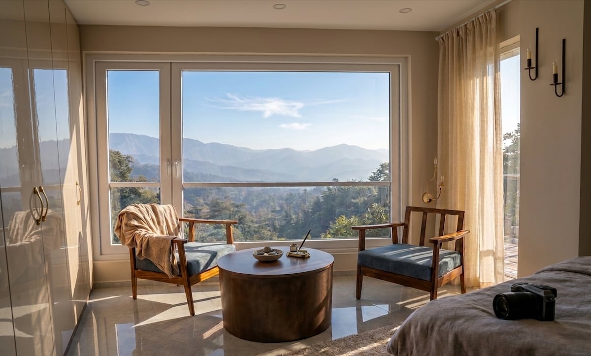 Escape to Serenity: Exquisite A-Frame Villa by Bhimtal Lake Imagine waking up to breathtaking views of Bhimtal Lake, surrounded by nature’s tranquility. Inside Your Haven: • Spacious Bedrooms: Two expansive bedrooms, each with an en-suite bathroom, provide the perfect blend of comfort and privacy. • Modern Amenities: A fully-equipped kitchen and open-plan living and dining area seamlessly merge indoor and outdoor spaces, perfect for relaxation and entertainment.