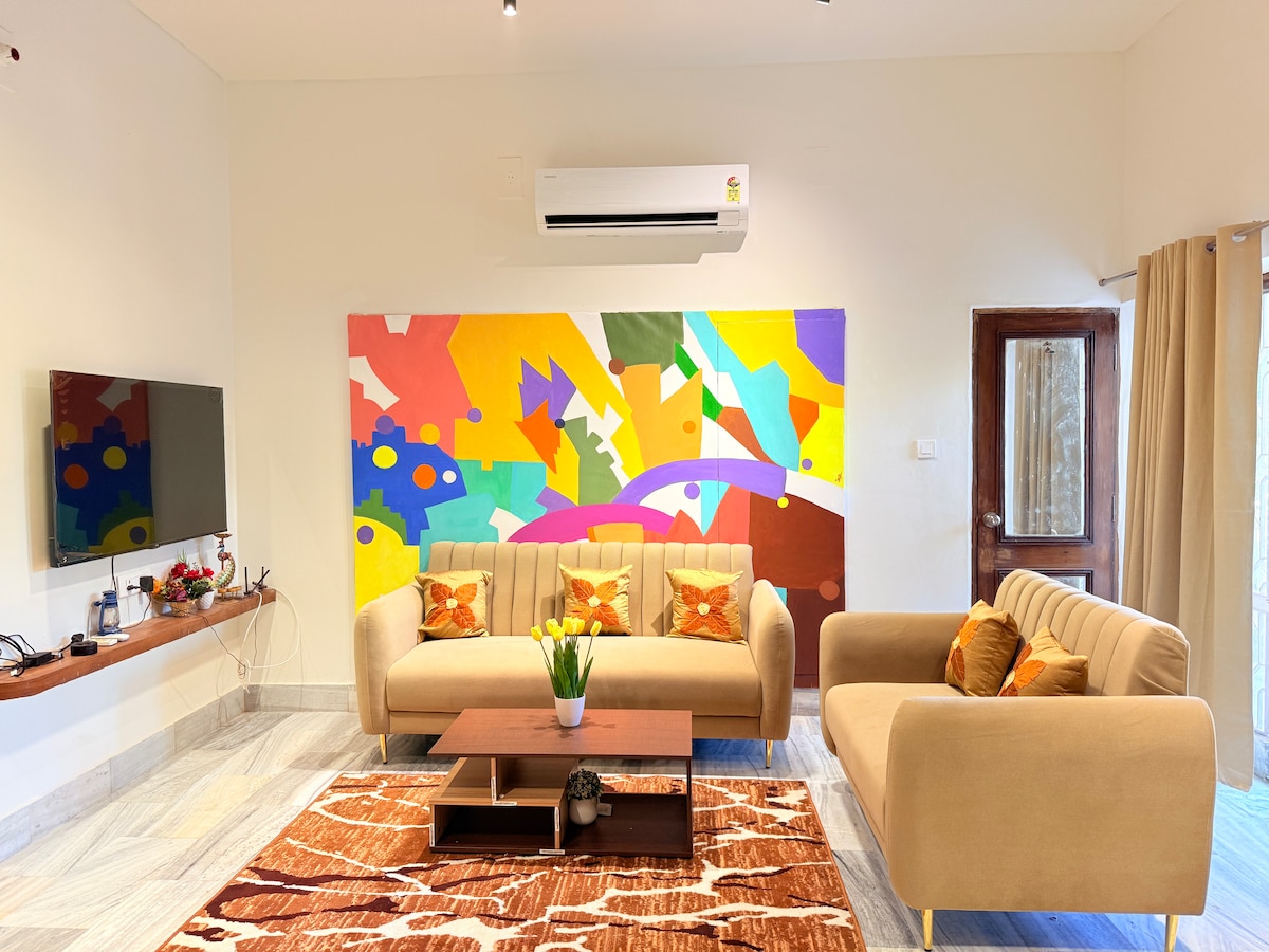 Nestled amidst the bustling Golf Course Road, yet offering a serene view of the Aravali forest range, this loft is a true urban oasis. Step into our spacious home with a living area, cozy dining area, and attached kitchen. Bedrooms offer rustic charm, comfy beds, ample storage, and access to peaceful terraces. A single bathroom is fully equipped. Enjoy views from two large terraces—one of the city and the other of the serene Aravali Forest, with a patio.