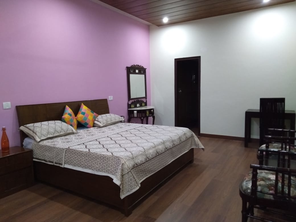 This beautiful property with huge terrace and a lawn is situated on national Highway 87 about 33 k.m from Kathgodam station. it is surrounded by pine tree forest. It’s Nainital 9 kms from Nainital in way to Bhimtal and Sattal. Kainchi Temple is only 8 Kms. This 2 bedroom apartment is comfortable for 4 adults and 2 children below 10 years, each bedroom has king & Queen size beds and the living has a comfortable sofa-cum bed, the kitchen is fitted with Induction and cooking utensils and geysers.