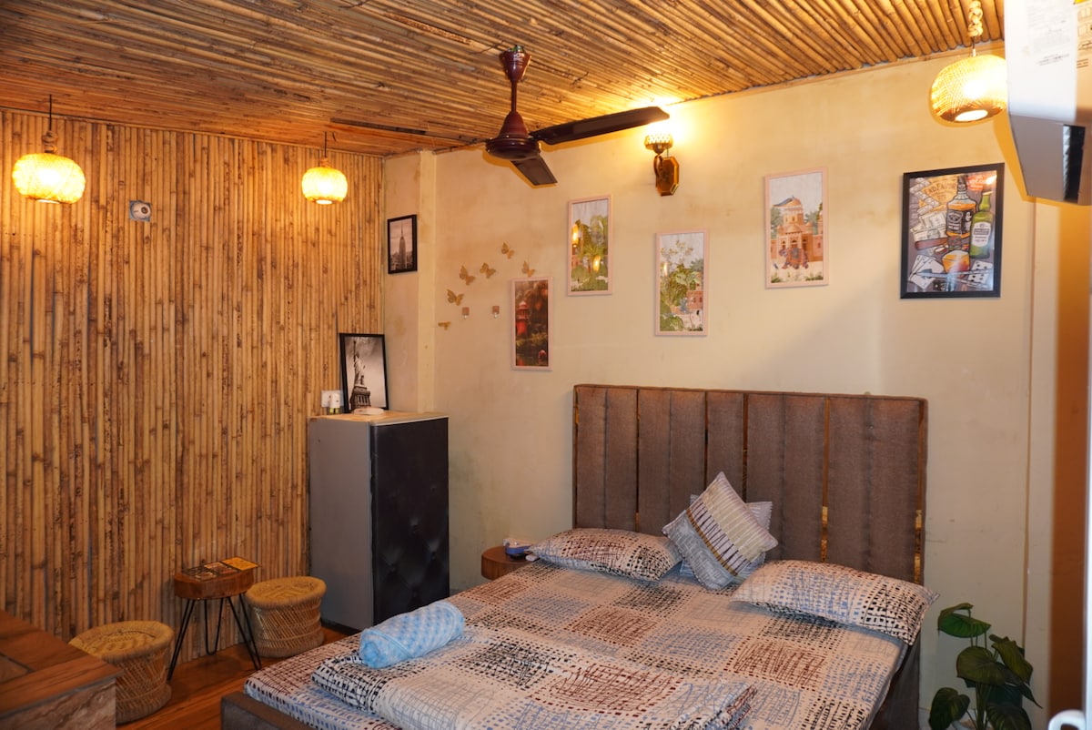 Escape to Shambhala, a hilltop getaway in the beautiful hills of Uttarakhand. 40 minutes away from Rishikesh and surrounded by stunning mountain views, this peaceful retreat is the perfect place for a restful getaway. A private Cabin is a modern but rustic space suited for two. Queen-size bed, modern emerald washroom, and a sitting area by the window perfect for your Insta feed. Perfect for a peaceful and romantic getaway.