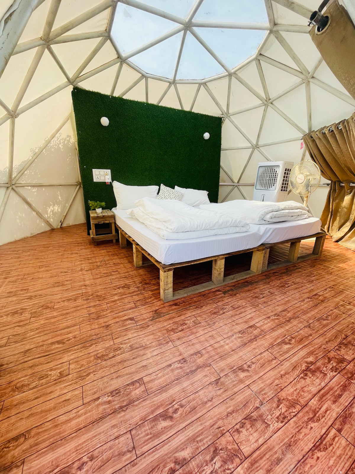 A luxurious Dome Glamping experience in the arms of Nature & river Ganges, a place to give you a heavenly stay and a unique experience. Enjoy the shades of nature when you stay in this unique place. While some people loves the Luxurious Domes with moonroof, some loves the pool with a view, while other spends their time with peace while seating in common pool side area, bonfire area or in our in-house tropical Cafe. We got you evenings covered with karaoke, open air cinema and musical vibes.