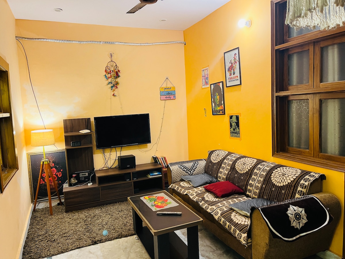 Cozy budget stay with all amenities- bathroom and kitchenette (microwave, cook-top, refrigerator, RO, utensils etc). Unique jazzy musical design, instruments and TV(netflix,prime,hotstar,zee,sony) available for recreation. Central location near sector 18, DLF mall of India, metro train at walking distance, wonderful location for foodies as amazing BP's street food and the famous Tea Shop and resturants within 500 meters. Night walks with ice cream stalls at 15 meters. Free parking right outside.