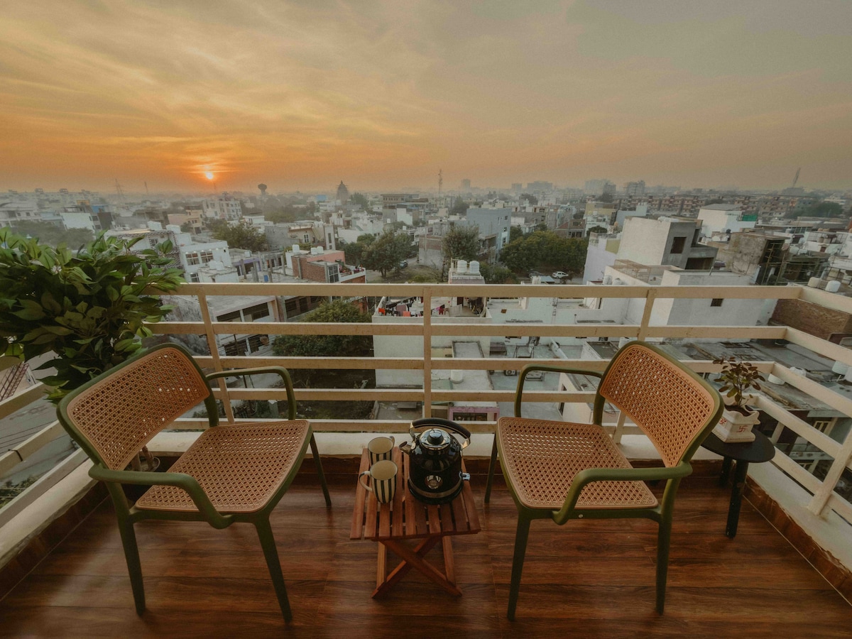 Welcome to our serene rooftop escape in the heart of GK1 ! This charming tiny house is perched on top of our building, offering a unique & peaceful retreat amidst the bustling city. The studio has a sleek, modern design making it perfect for travelers looking for a stylish yet cozy stay. U have exclusive rooftop perfect for evening or morning yoga. Please note, reaching this hidden gem requires climbing three flights of spiral stairs, so it's best suited for those who are fit and adventurous.