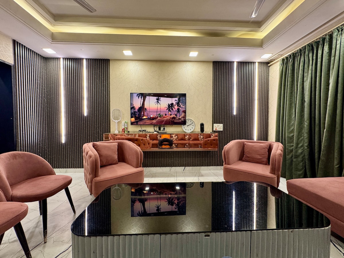 Nestled in the heart of Delhi, our enchanting property offers a sanctuary of tranquility amidst the bustling cityscape. Step into our private haven adorned with lush greenery and season fruits Indulge in the mesmerizing ambiance of our multi-color lighting in the hall, casting a soft glow upon our plush 12-seater sofa, inviting you to sink into blissful relaxation. For the modern-day nomad, our high-speed internet ensure seamless productivity amidst the comforts of home.