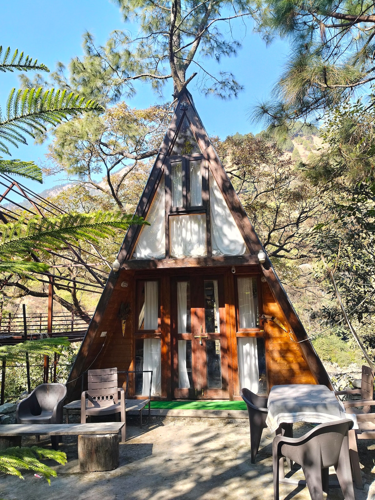 Escape to Shambhala, a hilltop getaway in the beautiful hills of Uttarakhand. 40 minutes away from Rishikesh and surrounded by stunning mountain views, this peaceful retreat is the perfect place for a restful getaway. A private Cabin is a modern but rustic space suited for two. Queen-size bed, modern emerald washroom, and a sitting area by the window perfect for your Insta feed. Perfect for a peaceful and romantic getaway.
