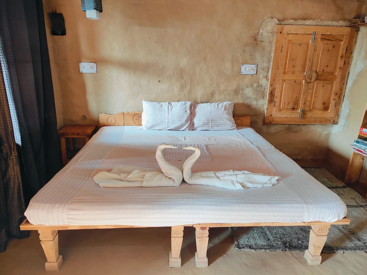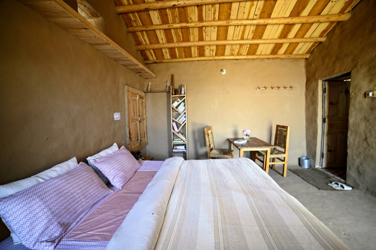 Kaaya's attic room is a twin story mud earth house, connected by an external staircase with one washroom on the ground floor. The campus has ample free sit-out spaces. It's perfect for families, couples, and solo travelers. Homegrown food in the nature cafe and peaceful surroundings will just make you stay longer ;) Remember, Air Conditioning (AC) is not available in any room. Ground floor is earth cooled and only a fan is sufficient