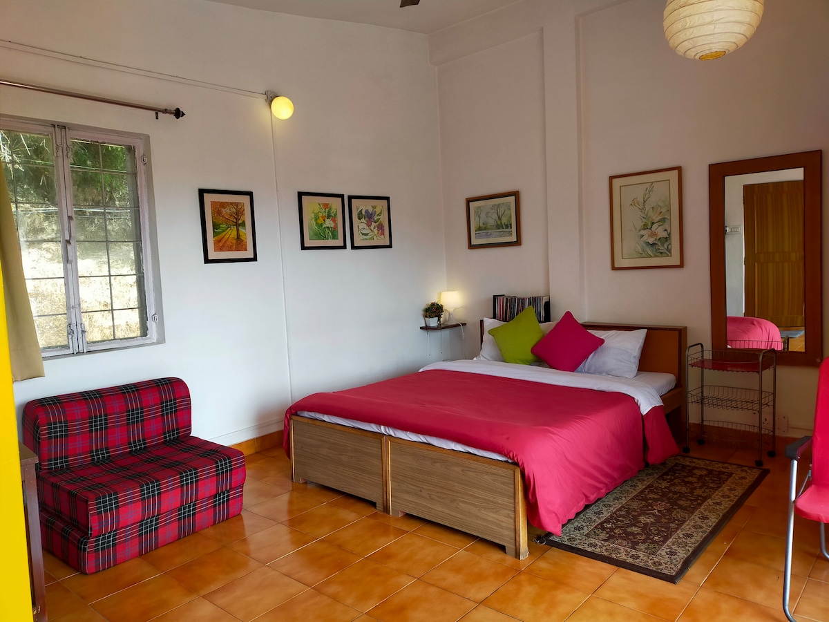 🏡SERENE MANSION HOMESTAY🌲 What you'd love about us- ✔Infant/Elder/Pet friendly ✔Calm nature wrapped neighbourhood amidst the poshest marketplace ✔Spotless clean interconnected bedrooms ✔Expansive living room ✔Bonfire/BBQ + Meals on demand ✔Plug-in EV charging ✔Fully equipped kitchen w/ all kitchenware & ready-to-cook groceries ✔Mountain view terrace +Lush lawns ✔Washing machine, gym equipment, RO & power backup ✔Netflix, PrimeVideo, Hotstar enabled Smart TV, 100Mbps WiFi, Xbox & board games