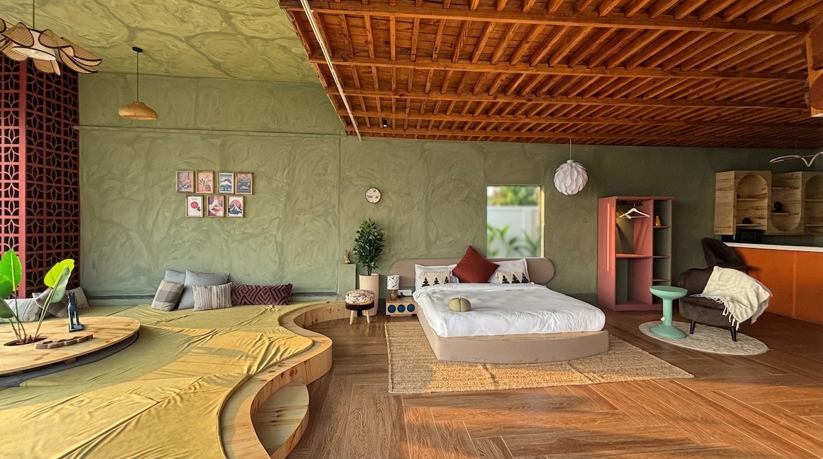 Welcome to Sundowner Stay, a peaceful wabi-sabi themed Ganga view retreat in Rishikesh. Enjoy a private jacuzzi with river views and watch Janki Setu light up in the evening for a magical experience. The room offers a private balcony, instant hot water with heat pump, strong rain shower, and a live hygienic jacuzzi. Perfect for couples or solo travelers seeking luxury, calm, and unforgettable memories by the Ganga.