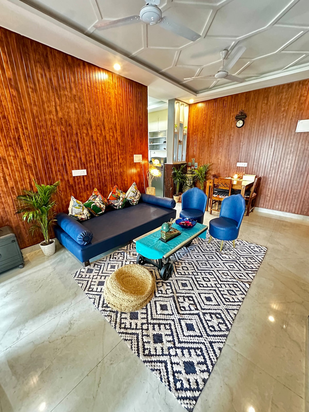 Ideal for those seeking peace, comfort, and natural beauty in Rishikesh. 3 bedrooms (1 double with ensuite, 2 twin), 2 bathrooms, 2 balconies, living room, AC, Wi-Fi, filtered water, fridge, microwave, toaster, kettle. Optional kitchen use: ₹350 + GST/day for full access to kitchenware. Full of light, surrounded by greenery and walking paths Easily reachable by car. Just 15 min walk to the Ganga (steep slope and steps—not suitable for elders or those with mobility issues).