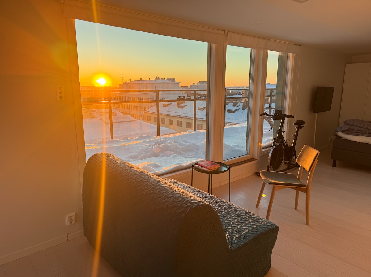 Welcome to our beautiful, bright & quiet 70m2 penthouse apartment in Kruununhaka, at the heart of seaside Helsinki - only a 10-min walk from popular sights. The large open living space includes a fully equipped kitchen, dining space and living room, and opens up to a terrace with sea views. The spaceous bedroom features a comfy double bed and working space. There’s a separate toilet and a spa-like bathroom with a rainfall shower & cozy sauna.