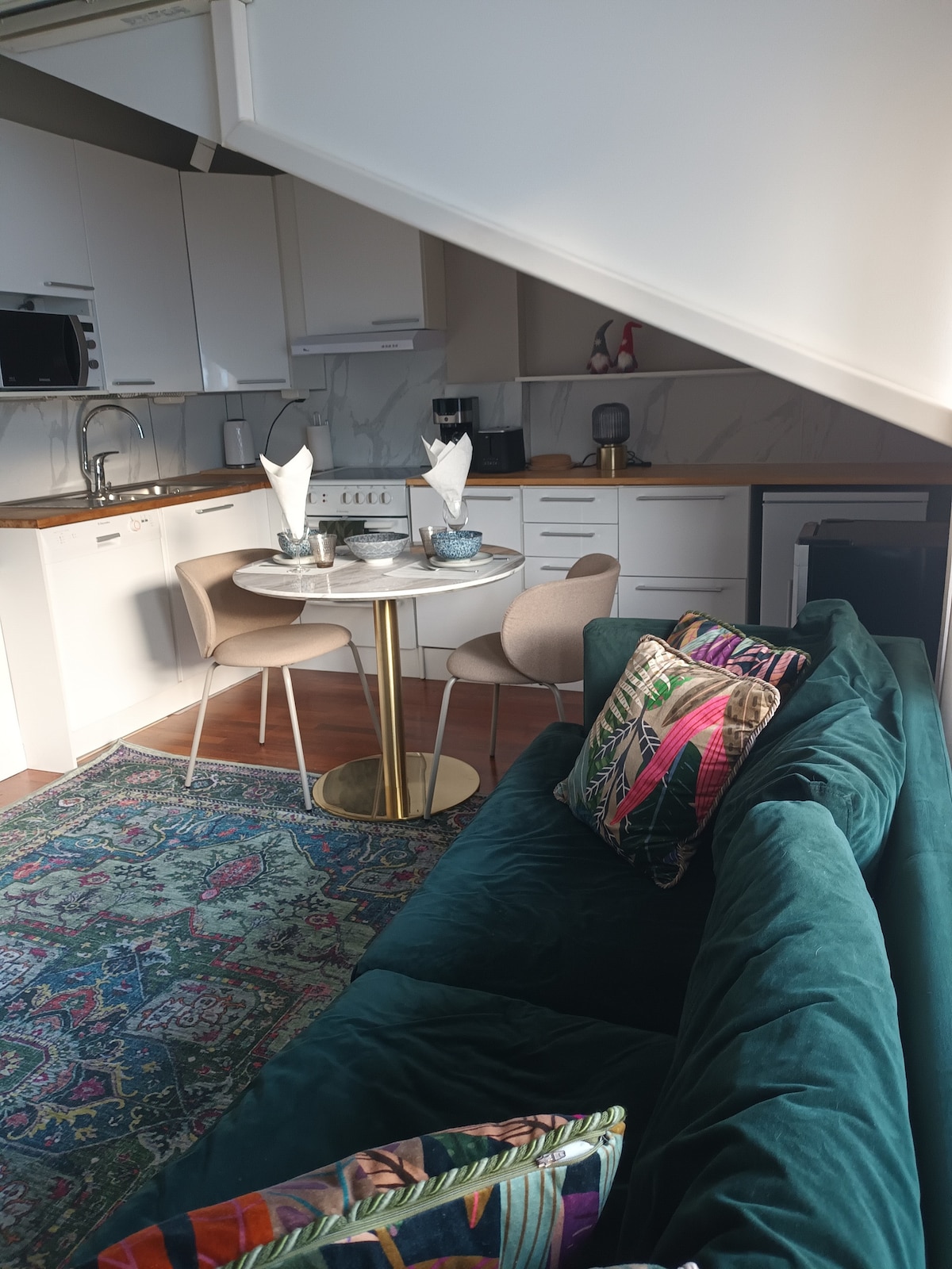 This modern 7th floor loft has everything you need for a comfortable stay in Helsinki's hippest area. - built in 2021 - modern kitchen & bathroom w/washer&dryer - room hight 4,3m - 2 french style balconies - free wifi - 5min from metro Next to lively Teurastamo (Meatpacking district) & Kalasatama metro station/Redi mall with restaurants, brand shops & services. Convenient for domestic and international travelling. Fully equipped for a longer stay. Beds up to 4 people.