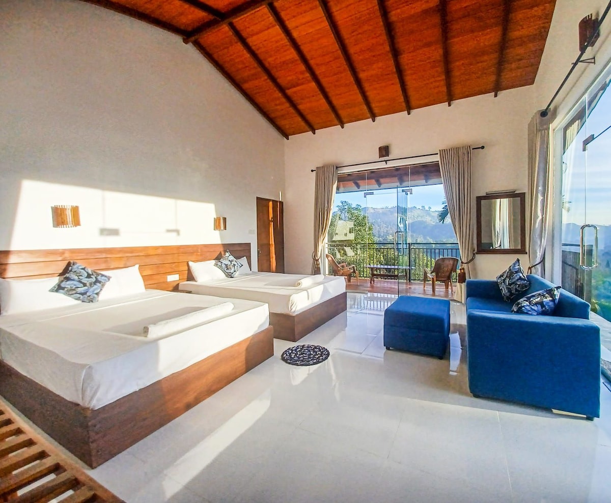 Welcoming to Ella panorama villa.A beautiful and Spacious Room waiting for you! . The family room offers 2 extra large bed, Fully temperd glass doors, air conditioning,Refrigerator, Electric Kettle and Tea and coffee amenities,a private entrance, a wooden terrace with panoramic mountain view as well as a private bathroom featuring a shower. And also 10min Walking distance to the nine arch bridge. We provide Free parking and High speed Wifi facilities.