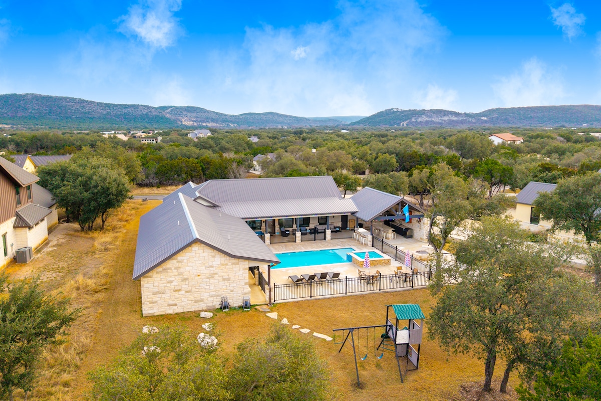 Howdy y’all and welcome to Concan’s #1 vacation rental, The Big Tex! Located on Hole #1 of the Frio Valley Ranch Golf Course with Scenic Hill-Country views, and just 2 miles from the Frio River. Have endless fun with unmatched amenities including a Heated Pool, Hot Tub, Outdoor Movie Theatre, Pickleball, Basketball, Sand Volleyball, Fire Pit, BBQ, Playscape, GAME ROOM including a golf simulator, arcade, & poker table. All bedding, towels & essentials provided. Just arrive, relax, & have FUN!