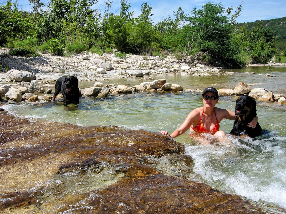 The Cabin is an acre located right on the beautiful Sabinal River with access to 600 feet of riverbank and easy walk into town. Architect designed, the cabin has high ceilings and lots of glass to bring the outdoors in. Relax in the hammock underneath gigantic cypress trees. Enjoy the sunset while the deer come through the yard and fireflies dance. We have two bedrooms on the ground level with a small loft (single bed) above the bedrooms.
