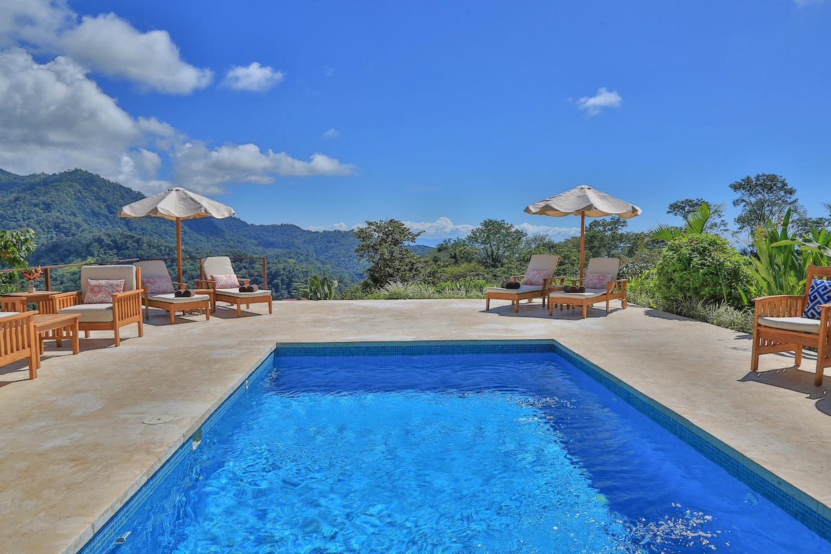 An upscale mountain jungle home set on 60 acres of secluded tropical forest replete with 5 waterfalls and private hiking trails. Toucans and wildlife galore in our hillside setting. 5BR main house (price inc 9 guests) 3 BR's in the garden bldg are available at extra cost of $49/n each. Fully staffed w/ daily breakfast included. Max capacity 20 guests. Daily housekeeping and concierge included. We are 3.5 hrs from SJO airport and 1 hr from Manuel Antonio park. 30 min from ocean at Dominical.