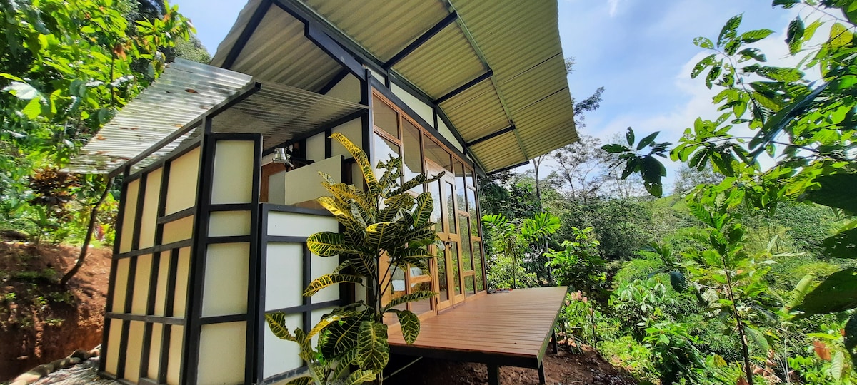 Wake up to the chirping of birds and greet the sunset with the sound of monkeys and other typical rainforest animals in this open-concept, handcrafted cabin made of native wood, 300 m from one of the most beautiful beaches in the South Pacific, Playa Chamán. The cabin has two floors, downstairs an open space with a living -dining - kitchen, a shower surrounded by plants and a small terrace. Upstairs, a spacious bedroom with mosquito netting and a balcony with an incredible view and hammock.