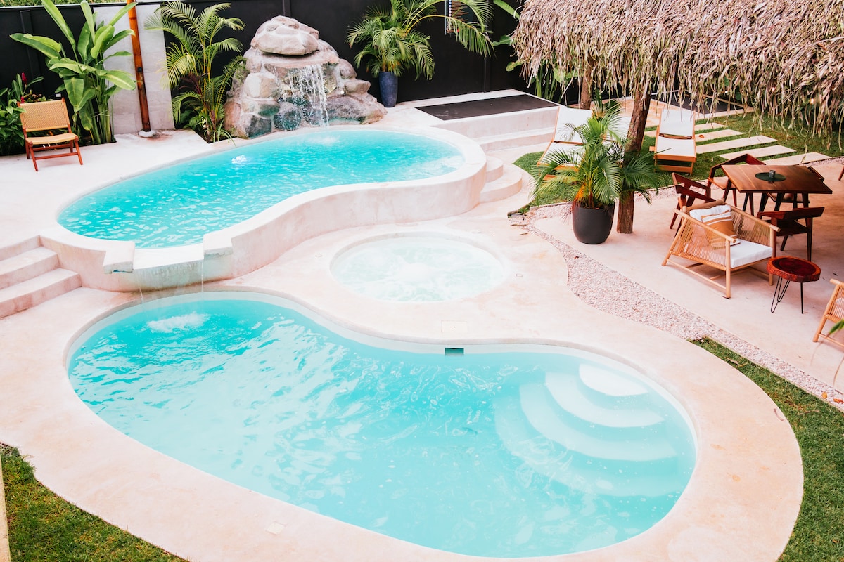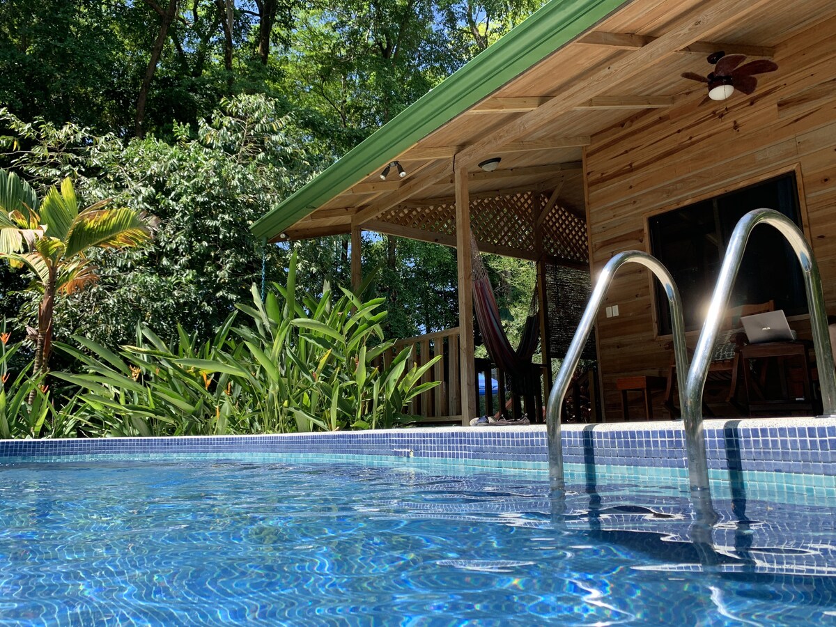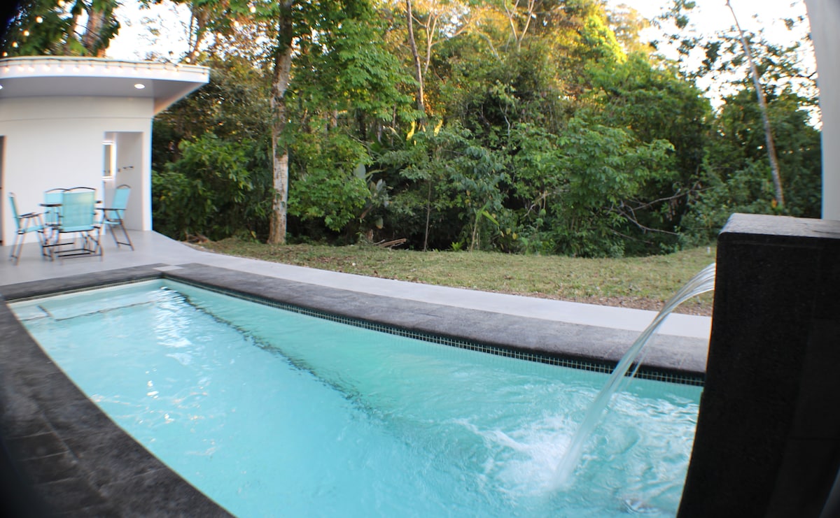 Experience the best of indoor-outdoor living in our modern 2-bed/2-bath home with floor-to-ceiling sliding glass windows, a private pool with mini waterfall, and a nature-filled creek abounding with wildlife and tranquility. This clean and family-friendly space offers privacy and safety. It is conveniently located at the end of a road. It's central location is a few minute walk from Uvita's town center, & beautiful beaches are just a 5-minute drive away.