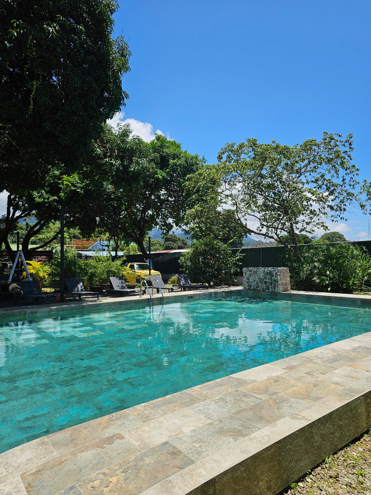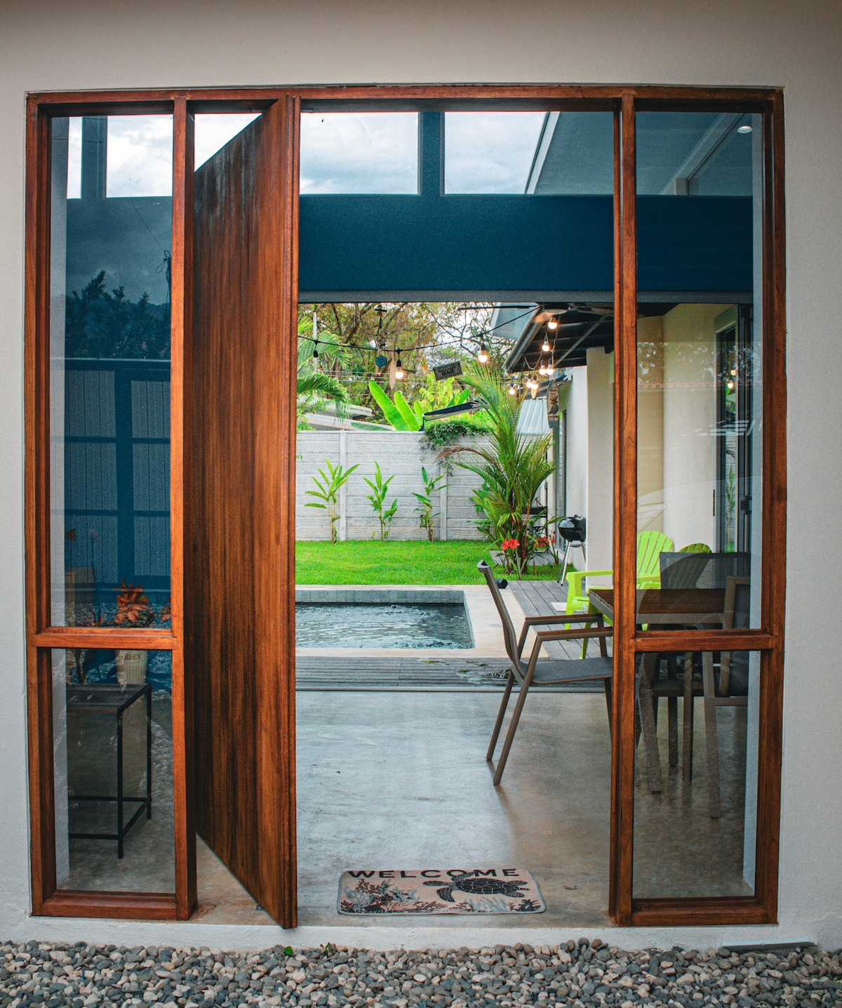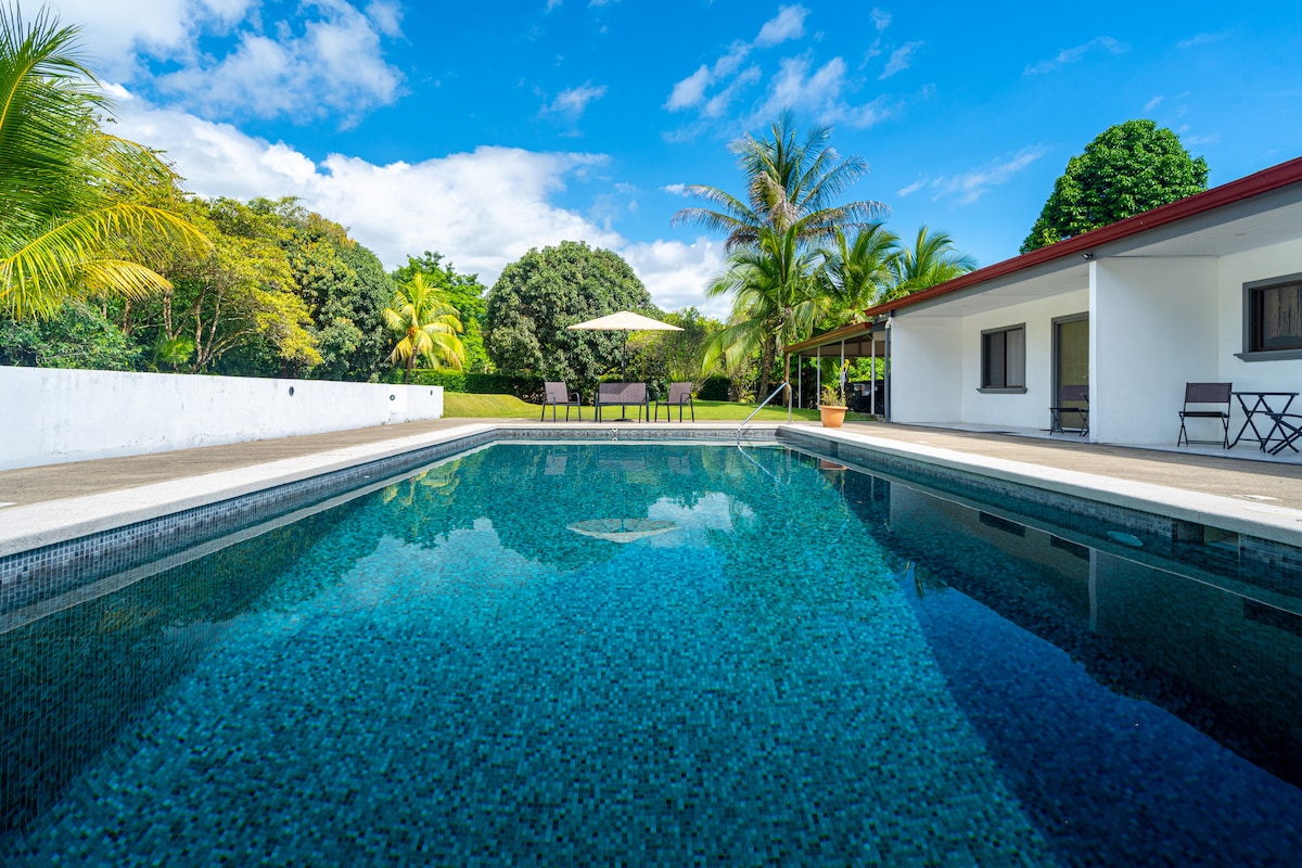 Experience the best of indoor-outdoor living in our modern 2-bed/2-bath home with floor-to-ceiling sliding glass windows, a private pool with mini waterfall, and a nature-filled creek abounding with wildlife and tranquility. This clean and family-friendly space offers privacy and safety. It is conveniently located at the end of a road. It's central location is a few minute walk from Uvita's town center, & beautiful beaches are just a 5-minute drive away.
