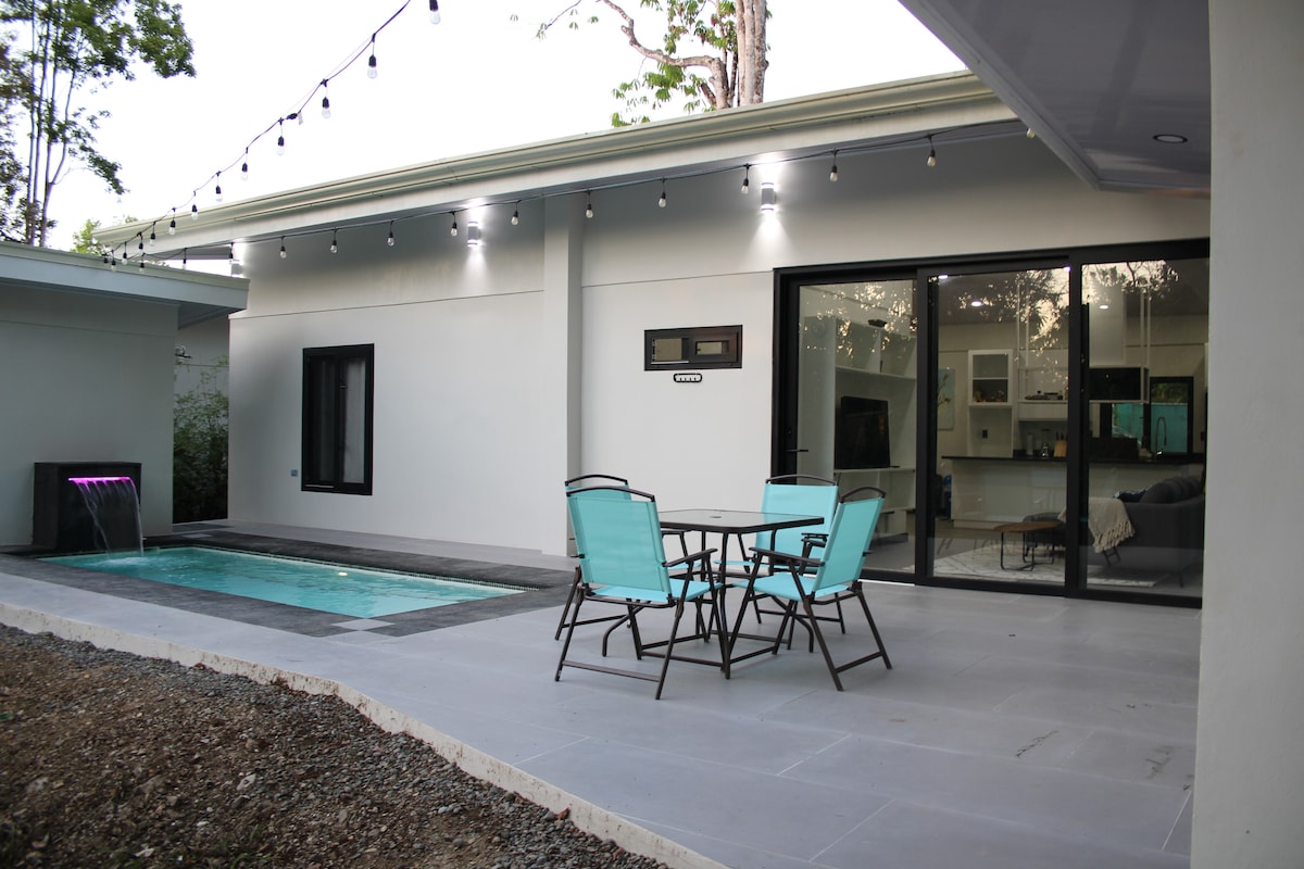 Experience the best of indoor-outdoor living in our modern 2-bed/2-bath home with floor-to-ceiling sliding glass windows, a private pool with mini waterfall, and a nature-filled creek abounding with wildlife and tranquility. This clean and family-friendly space offers privacy and safety. It is conveniently located at the end of a road. It's central location is a few minute walk from Uvita's town center, & beautiful beaches are just a 5-minute drive away.