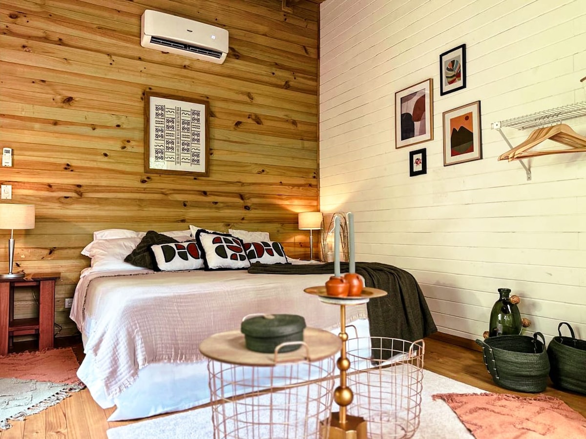 Spacious and private 🌿 This 40 m² private cabin features a spacious bathroom, outdoor shower, private garden, and a large bedroom with air conditioning. The kitchen-dining area includes two sofas, ideal for resting, reading, or enjoying long conversations. Surrounded by greenery, it offers both comfort and privacy in a peaceful natural setting. Includes access to all Arboura amenities.