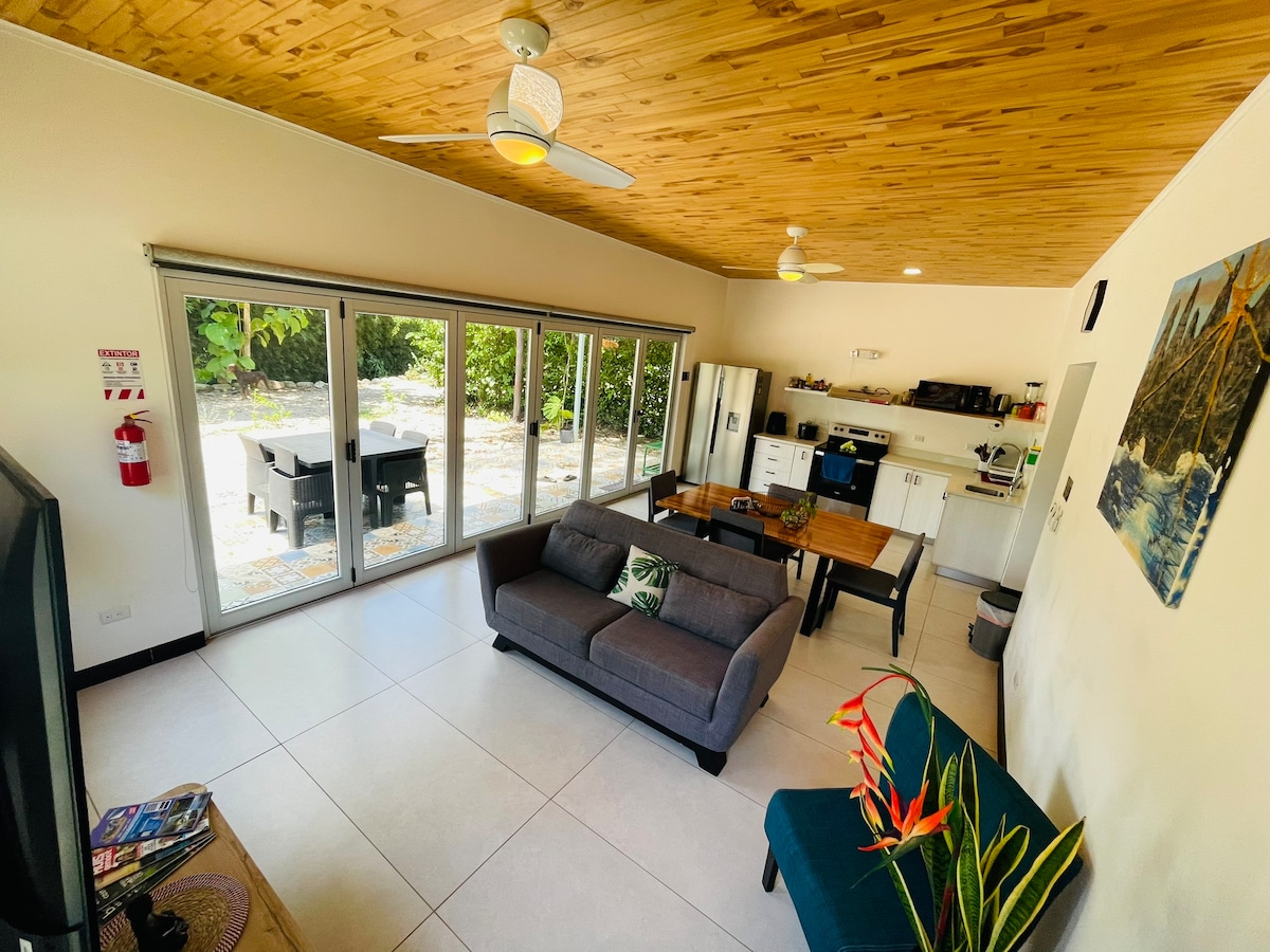 Experience the best of indoor-outdoor living in our modern 2-bed/2-bath home with floor-to-ceiling sliding glass windows, a private pool with mini waterfall, and a nature-filled creek abounding with wildlife and tranquility. This clean and family-friendly space offers privacy and safety. It is conveniently located at the end of a road. It's central location is a few minute walk from Uvita's town center, & beautiful beaches are just a 5-minute drive away.