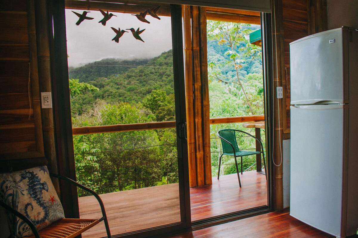 Bambura Cabin 2: builted with bamboo and wood which makes the place warm and cozy. Surrounded by impressive mountains. You can watch little birds, toucans, monkeys and other animals passing by. Balcony, mountain view. Perfect for working remotely or relaxing. Studio-style space with a full bed. Fully equipped. Shared pool (4x3m). 4 cabins in the property. Internet Fiber optic. We recommend SUV or 4x4 car. We are in the mountain of Playa Hermosa, near Uvita and the Marino Ballena National Park.