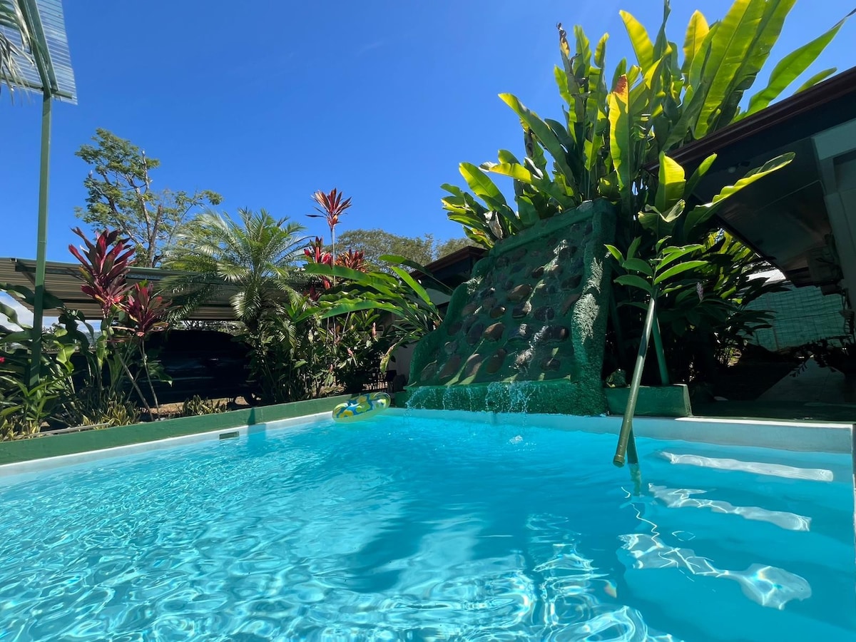 Two-bedroom, one-bathroom house, pet-friendly, air-conditioned, with an amazing pool, waterfall, climbing wall, and a wonderful garden where you can enjoy and relax in the tropical life of Uvita, just a few minutes' walk from the famous Whale's Tail and its wild and spectacular beach! The house is perfect for 5 people and features a large porch with a fully equipped kitchen next to the pool, where you can enjoy a delicious barbecue with family or friends. You can stroll to restaurants and shops!