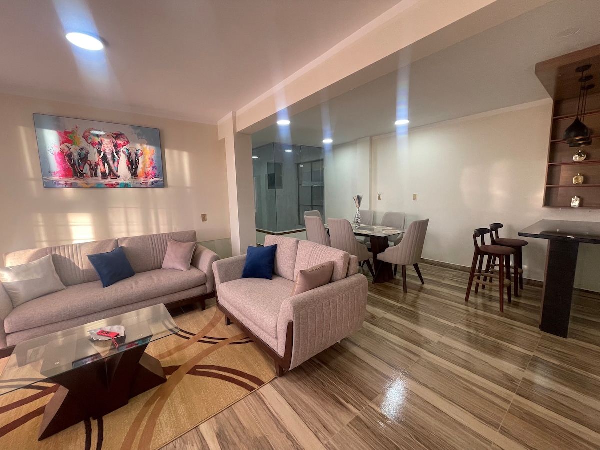 Apartamento amplio, tranquilo, independiente y con todas las comodidades como sala de estar, cocina y comedor de estilo americano. Apto para grupos de familia y amigos. Cocina totalmente amoblada y equipada con lo necesario para que pases una estancia agradable como en tu propio hogar. Habitaciones acogedoras y camas cómodas para un buen descanso después de una gran aventura. Tu familia estará cerca de todo cuando te quedes en este alojamiento céntrico.