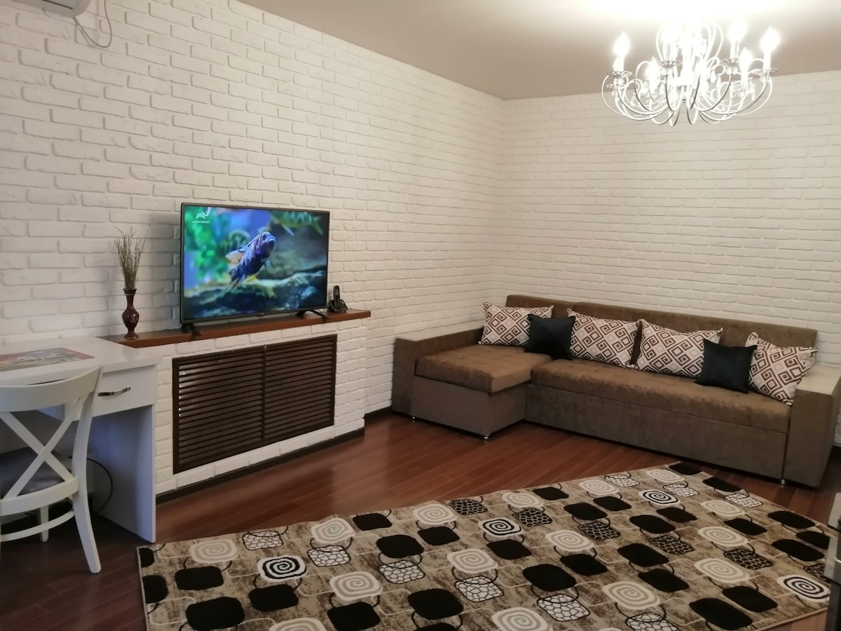 This home is a great choice for relaxing after work and recharging in a calm and stylish place. Brown bricks on the walls remind streets of New York. Conveniently located on the 2nd floor, within walking distance from the subway station and farmer's market with fresh fruits and vegetables. Прекрасно подходит для отдыха после работы. Перезагрузитесь в этом стильном месте. Квартира удобно расположена на 2 этаже, в пешей доступности от базара и метро