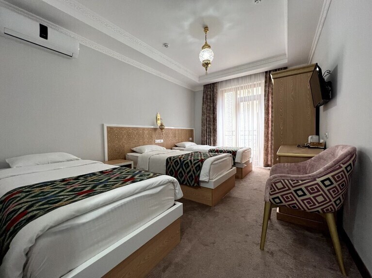 Уютный бутик-отель в центре Самарканда, рядом с площадью Регистан. Разные типы номеров подойдут для пар, семей, друзей и деловых гостей. В отеле есть ресепшн, быстрый Wi-Fi и всё необходимое для комфортного проживания. Отель сочетает современный комфорт и восточную атмосферу. Гости могут отдыхать на общей террасе с панорамным видом на Регистан — идеальное место для спокойного отдыха и вечернего чая с видом на легендарную площадь Регистан
