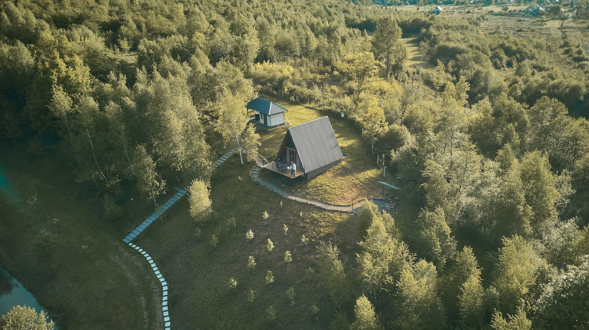 Dobrede — це затишні трикутні будиночки під лісом, на приватній території з озером, альтанкою та зонами для барбекю. Поруч струмок і річка, що додає особливого шарму. На території є чан із функцією джакузі, доступний за попереднім замовленням. Кожен будиночок вміщує до 4 осіб: на другому поверсі — двоспальне ліжко, на першому — розкладний диван. У будиночках є повністю обладнана кухня, що дозволяє готувати самостійно.