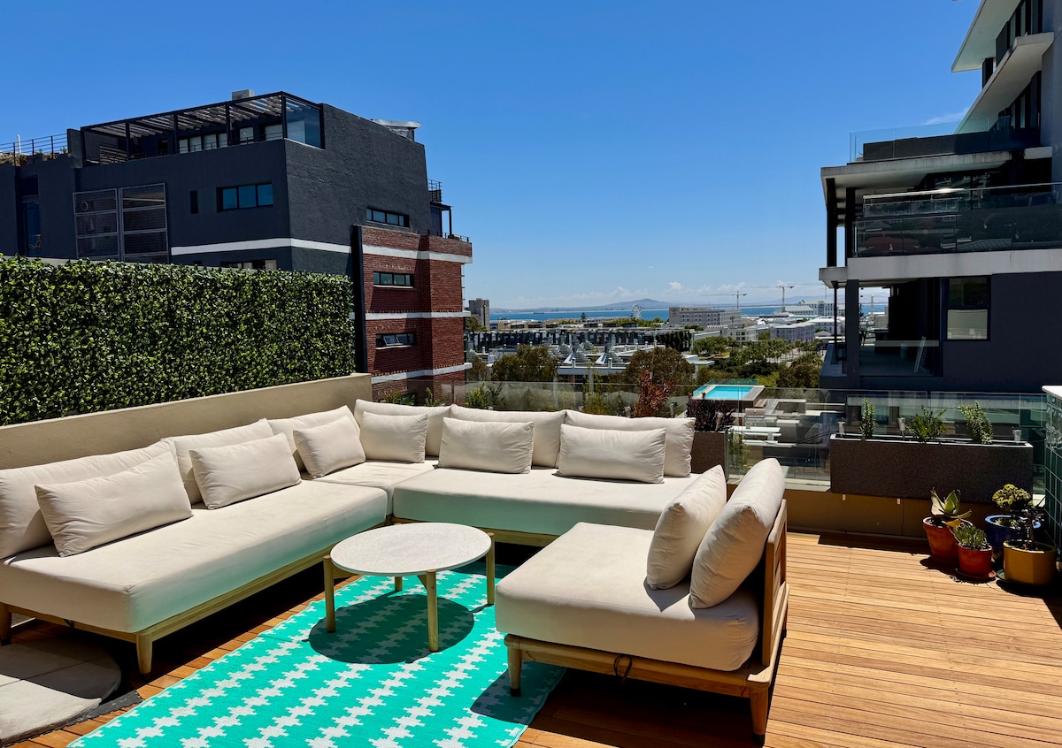 A chic, modern apartment with a big balcony, in the heart of trendy Bree Street, surrounded by top-notch restaurants and just a short walk to all city highlights. Stylishly decorated with all amenities for a super comfortable stay. Perched on the 21st floor, enjoy breathtaking views of the city, Stadium, Robben Island, Signal Hill, and the sparkling sea. Relax on the rooftop terrace with a refreshing drink from the bar. Just a stroll away from the CTICC and the V&A Waterfront. @CapeTown16onBree
